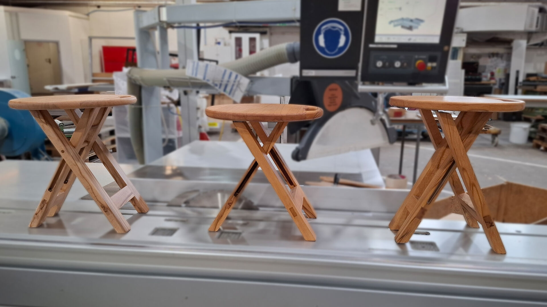 Das Ergebnis kann sich sehen lassen: Drei Hocker nach demselben Plan – und doch sind sie Unikate. Auf den ersten Blick ähneln sich die Hocker, doch in der Ausführung zeigen sich die Unterschiede. Jeder Auszubildende nutzte das vorhandene Wissen und persönlichen Geschmack in der Verarbeitung – etwa bei der Wahl und Umsetzung der Oberfläche – und verlieh dem Werkstück eine eigene Note.