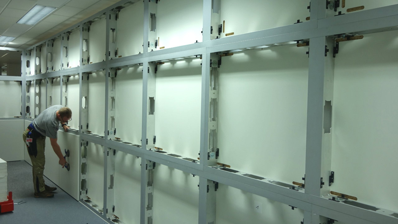 Die von uns bereitgestellten Trennwände bestehen aus einer Aluminium Trägerkonstruktion und Anhängeplatten. Unser ISIDesign Module wurden so konzipiert, daß diese sich an die Raumhöhe anpassen lassen. Die vorgefertigten Elemente werden auf einer Rahmenkonstruktion befestigt.
