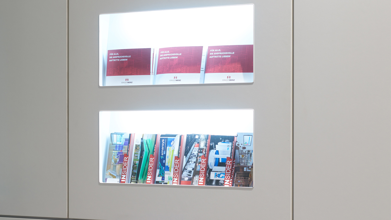 Für die ISIDesign Trennwände bieten wir Ihnen praktisches Zubehör mit an. Dazu zählen wir (Einbau-) Monitore, Fenster oder Türen. Mit speziellen Aussparungen schaffen wir zusätzlichen Platz für Vitrinen, Schaukästen oder Displays. Damit Sie Ihr Büro weiterhin wie gewohnt nutzen können, montieren wir bei Bedarf auch Steckdosen. Strukturierte Verkabelung für EDV Systeme lassen sich einfach einfügen.